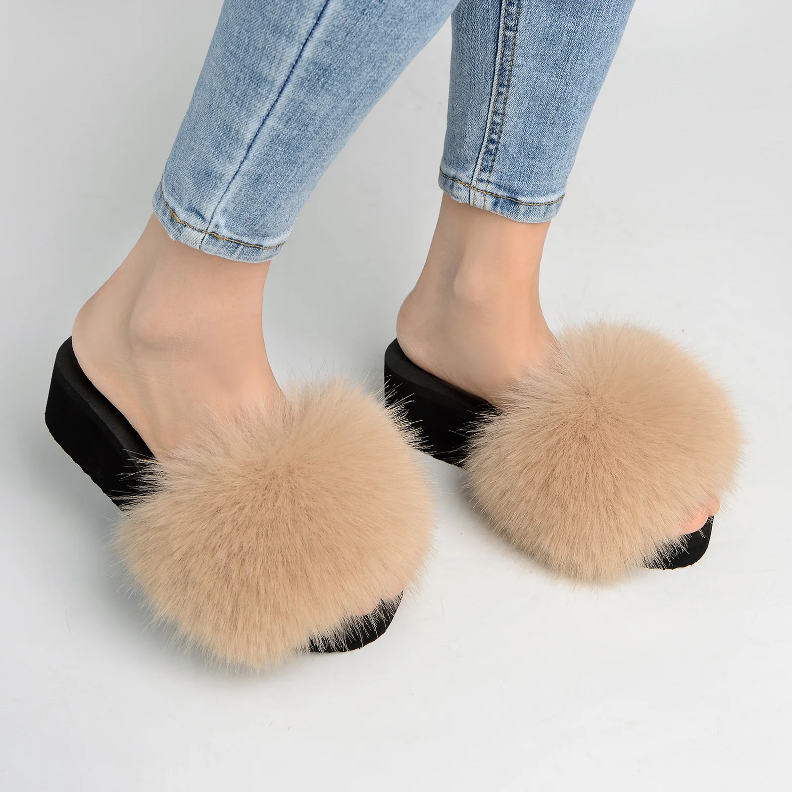Pantoufles Compensées En Fourrure Antidérapantes Pour L’été